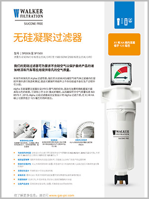 WALKER凝聚式無硅過濾器選用鑄鋁殼體,注重氣流的優(yōu)化,過濾器在油霧和微粒攔截方面都有出色的表現(xiàn),過濾精度達到0.01微米,確保出口壓縮空氣符合ISO 8573-1:2010標準,1微米無硅過濾器和0.01微米過濾器的飽和壓差低于125mbar。WALKER凝聚式無硅過濾器在特殊生產(chǎn)車間制造,只為確保無硅過濾器、無硅濾芯以及附屬配件在生產(chǎn)過程中全程不存在含硅聚合物,也不會在生產(chǎn)過程中引入含硅聚合物。WALKER凝聚式無硅過濾器的測試環(huán)境也是不存在含硅聚合物,不會引入含硅聚合物,做到生產(chǎn)和測試環(huán)節(jié)全程無硅化。